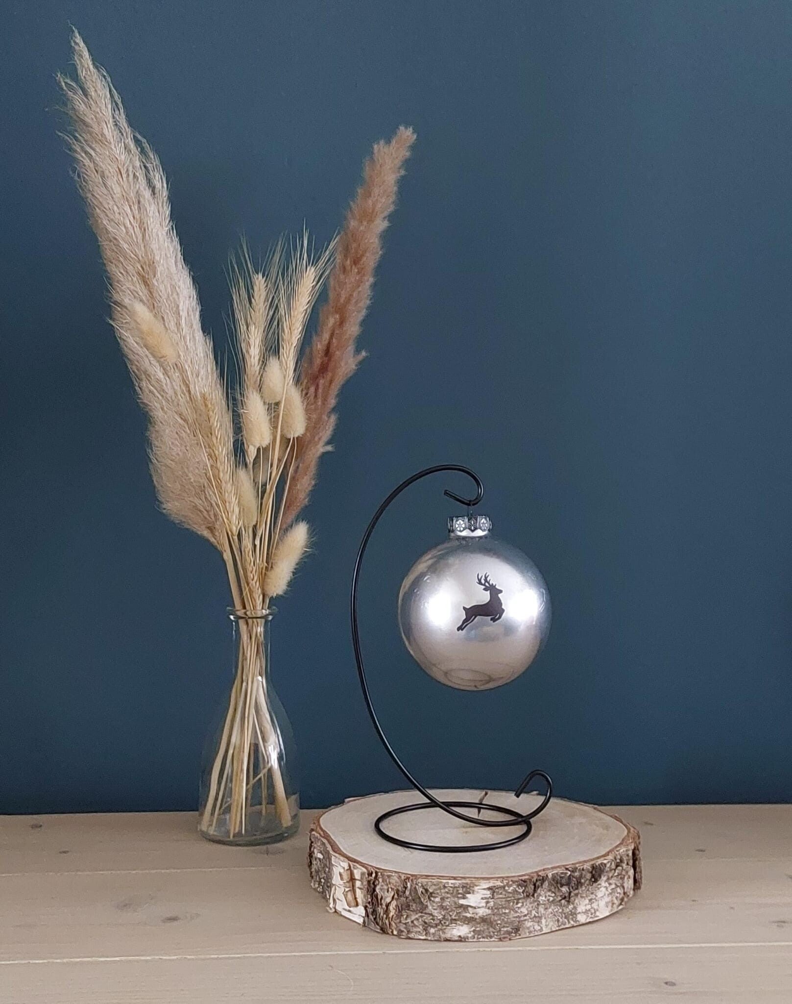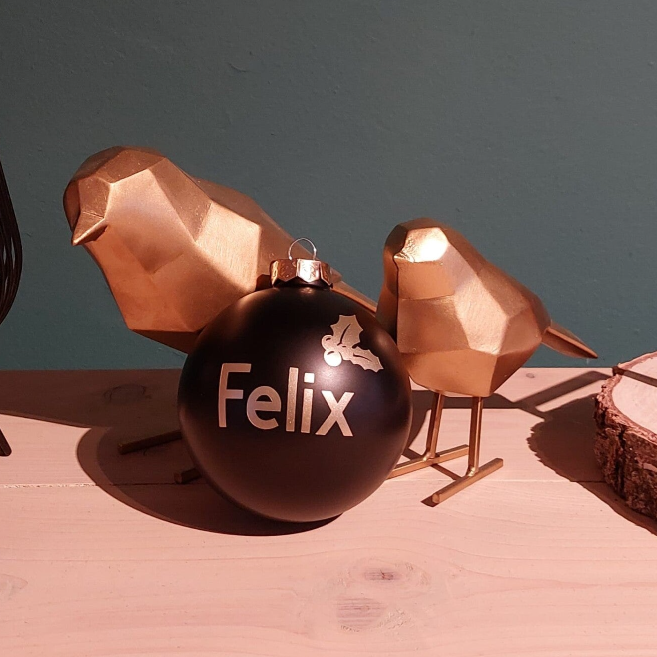 Kies de kleur van je kerstbal, kies de tekst en/of de afbeelding, voeg er nog een lintje aan toe, laat hem inpakken in een zilveren doosje.